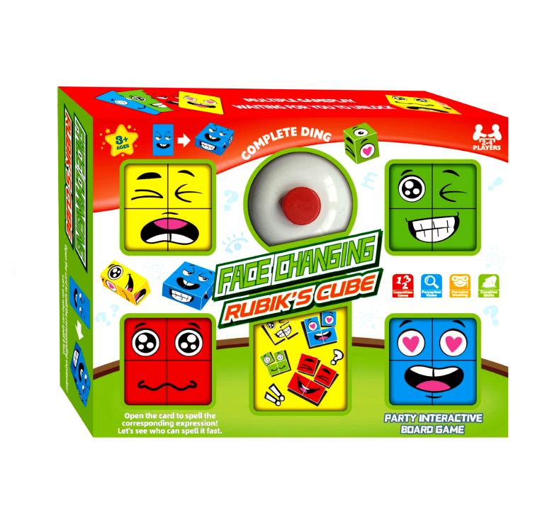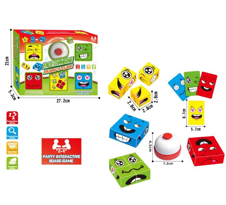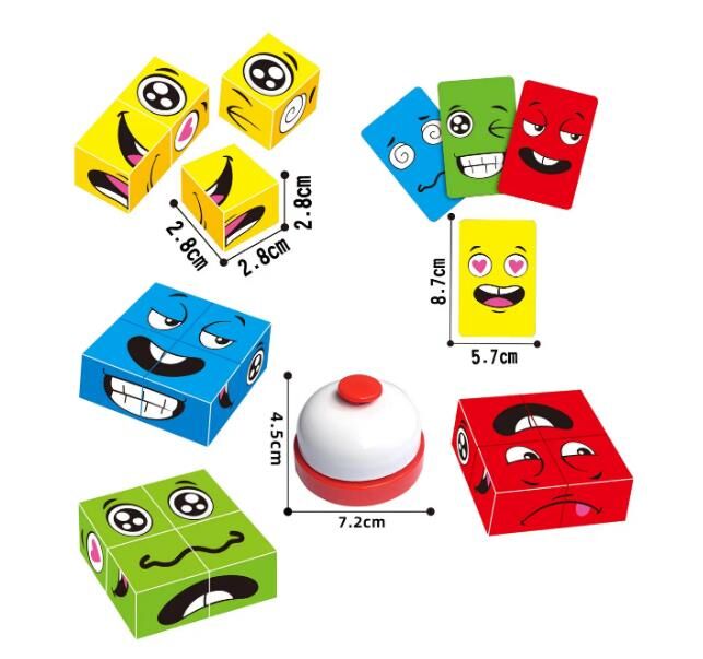 Гра включає 16 кубиків (по 4 одного кольору), набір карток із завданнями (виразами облич) та дзвінок.