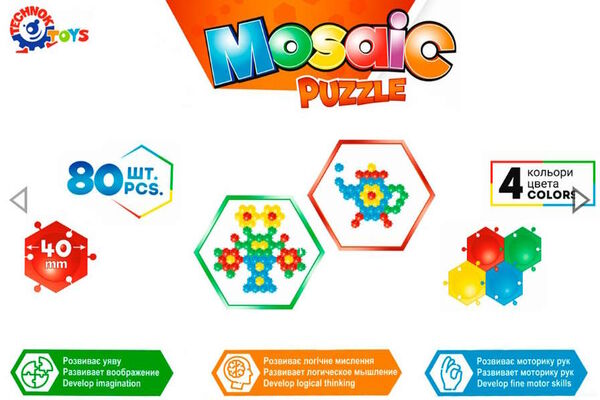 Мозаика-пазлы состоит из крупных цветных шестиугольников (80 деталей), из которых малыш может составить любые фигурки и узоры.