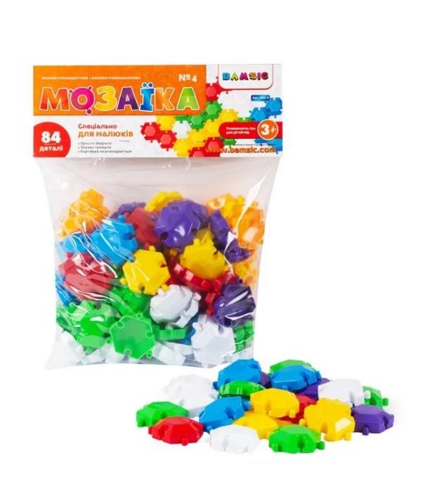 Різнобарвна мозаїка №4 від українського виробника "Bamsic" містить в собі 84 ігрових елементів виконаних в єдиній конфігурації та представлені в 7-ми яскравих колірних рішеннях: жовтий, помаранчевий, фіолетовий, блакитний, червоний, білий і зелений. Кожна деталь являє собою плоский шестигранник з трьома виступами та трьома відповідними виїмками. Завдяки таким пазовим з'єднанням, ігрові елементи відмінно скріплюються між собою і малюк зможе з легкістю об'єднати компоненти та створити справжнє мозаїчне панно. Мозаїка виконана з високоякісного первинного пластику, який абсолютно безпечний для дитячого здоров'я. Розмір одного елемента - 6х1х6 см. Розмір упаковки: 28 см * 8 см * 37 см,Упаковка: Пакет,Вік: від 3 років
