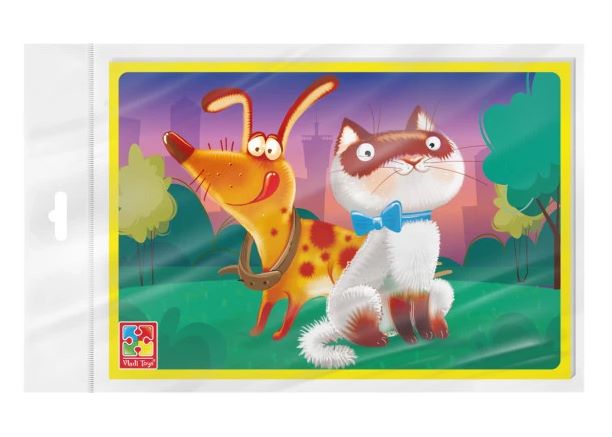 Дружні котик та песик дуже чекають на знайомство з вашим малюком. Для цього потрібно лише зібрати пазл!