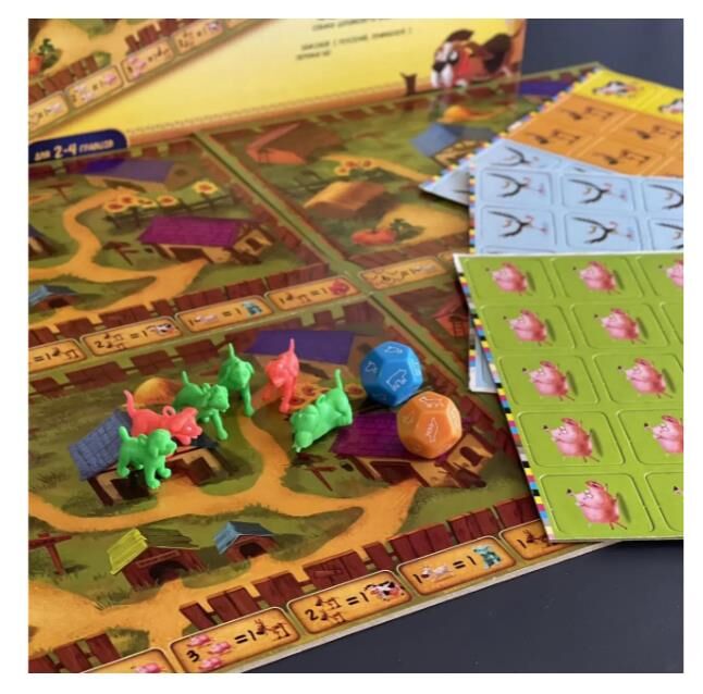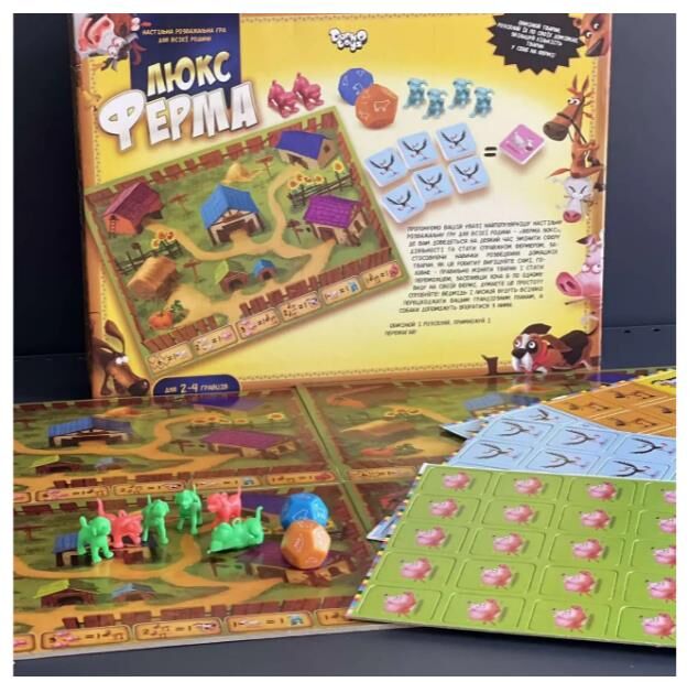 Захоплююча і динамічна настільна гра Ферма Люкс. Підходить для ігор, як всією сім'єю, так і веселою компанією діточок або дорослих від 2 до 4-х чоловік. Правила гри дуже прості, але при цьому не менш захоплюючі. Завдання кожного гравця зібрати свою ферму. Для цього кожен гравець по черзі кидає кубики. Перше своє тварина можна отримати, якщо на двох кубиках буде зображення одного і того ж тварини. Далі можна буде розмножувати своїх тварин, і обмінювати їх на інших застосовуючи свої власні тактику і стратегію. І в той момент, коли, здавалося б, все легко і просто неодмінно з'являється лисиця, або ведмідь, які захочуть перешкодити вашим планам Переможцем гри стане той, хто швидше за всіх укомплектує свою ферму. Якісна комплектація: поле і фішки з щільного картону, пластикові великі кубики і фігурки собак. У комплект входять: 4 ігрових поля, 120 фішок тварин, 2 багатогранних кубика, 6 фішок собак, правила гри.