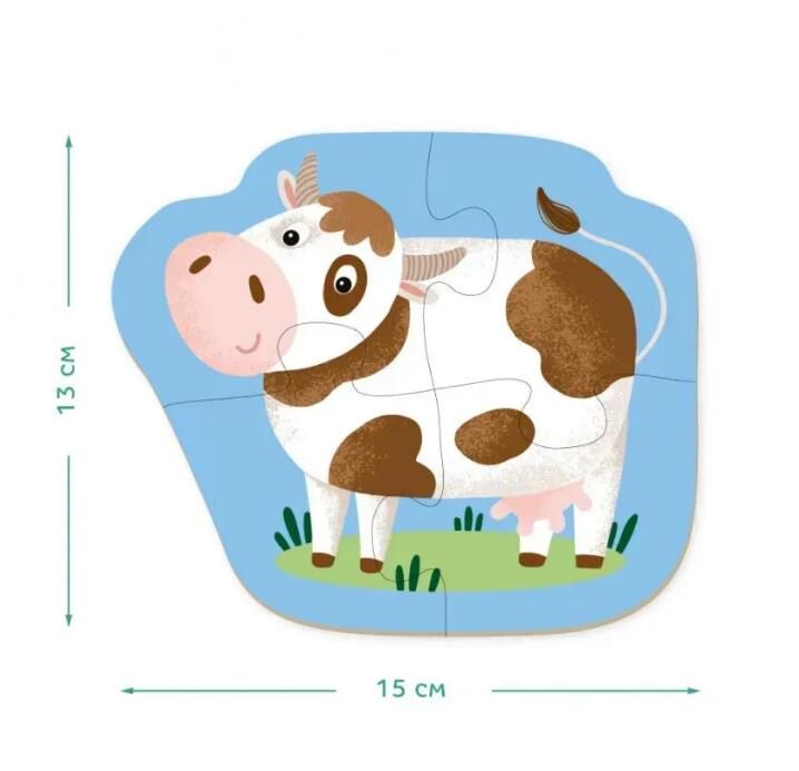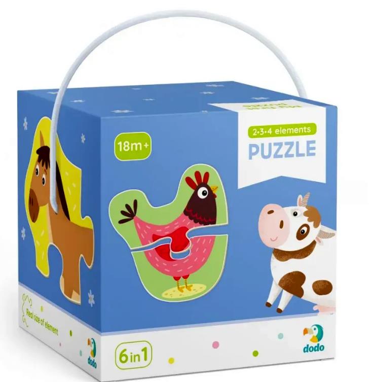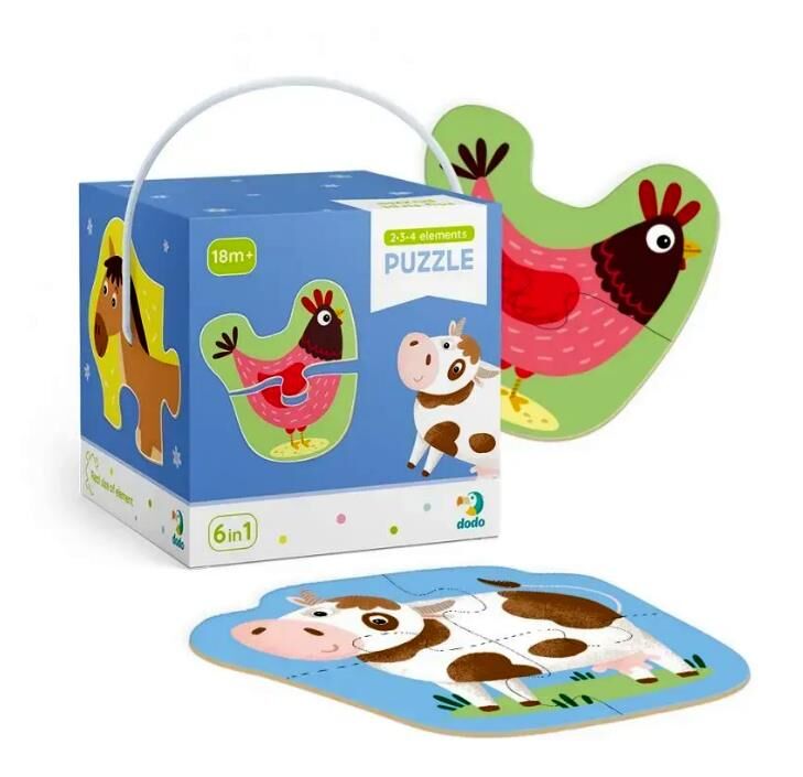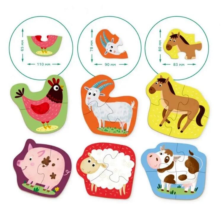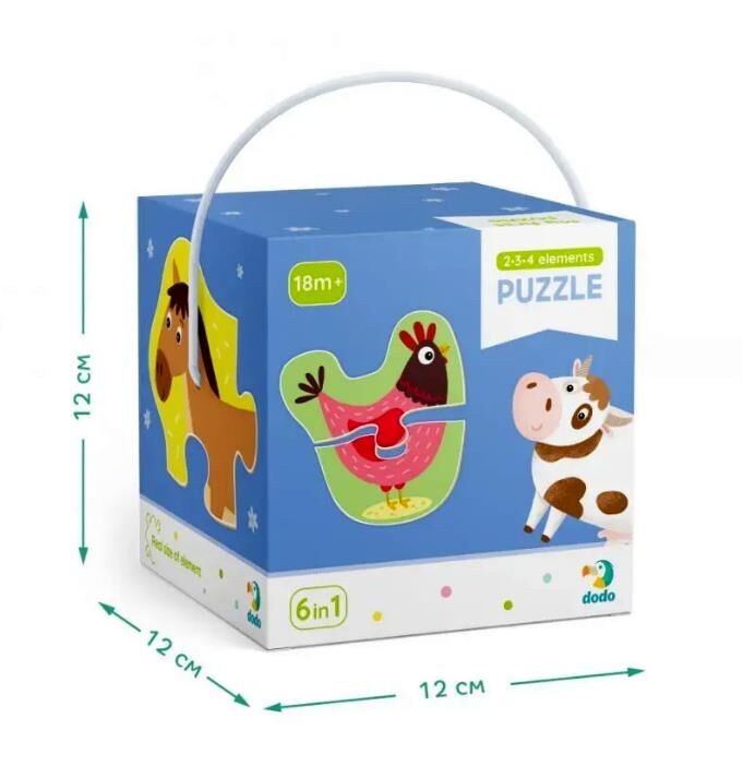 Набір пазлів Вік: від 18 місяців Кількість елементів: 2 пазли на 2 елементи, 2 пазли на 3 елементи, 2 пазли на 4 елементи Розмір зібраного пазла: приблизно 14-15 см Розмір коробки: 12х12х12 см