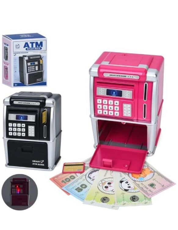 матеріал: пластмаса у наборі: термінал-рюкзак 14-19,7-12 см, на коду, зі звуком, музичний, світиться, затягує купюри, гроші, картка, на батарейці доступно: 2 кольори упаковка: у коробці 29-23-10 см