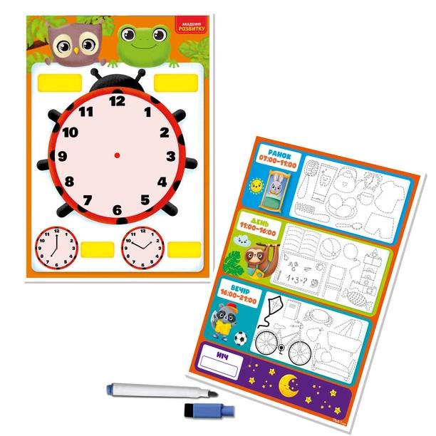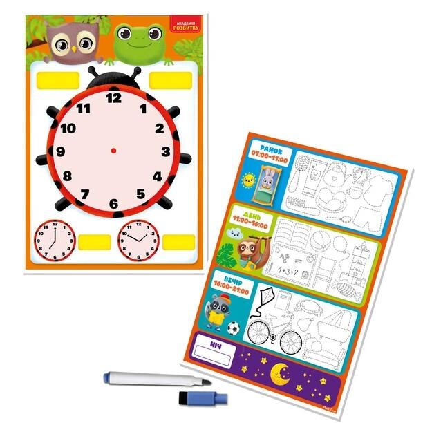 Обводьте, малюйте, навчайтеся та грайте разом із дошкою-тренажером «Години та розпорядок дня» Що робити? Розвиваючий набір включає двосторонню дошку і маркер. З одного боку зображено годинник, а з іншого – розпорядок дня. Доповнюйте зображення маркером та навчайтеся граючи. Маркер легко витирається з поверхні дошки, так що малювати можна багато разів!Граємо та тренуємо: мова, читання, логічне мислення, пам'ять та дрібну моторику. А також вчимося порядку дня. Набір містить: двосторонню дошку А4, маркер «Пиши-витирай».