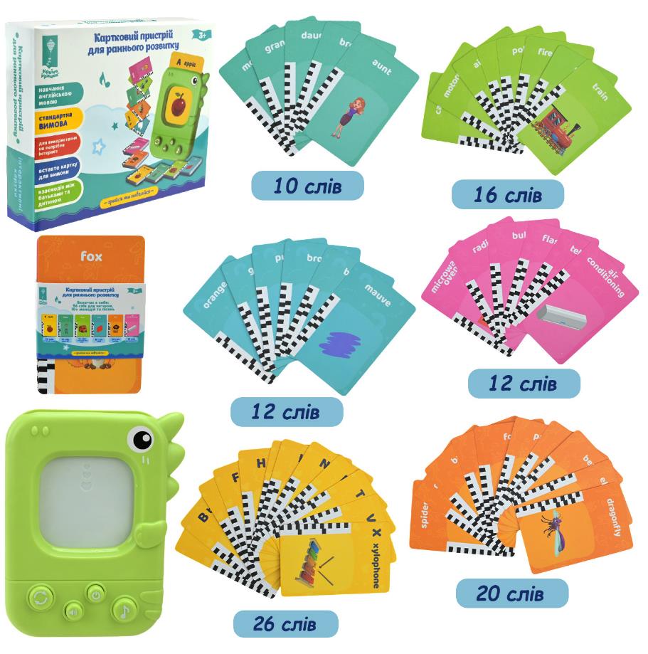• Інтерактивний досвід: при вставленні картки пристрій озвучує слово, забезпечуючи правильну вимову.