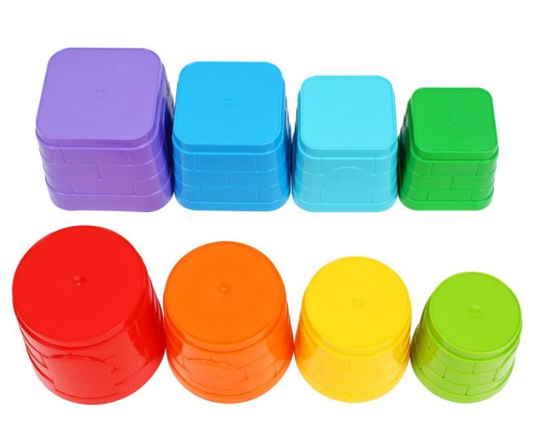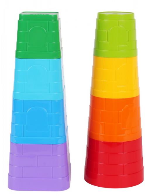 Кожна пірамідка складається з 4 різних за розміром та кольором елементів. Щоб зібрати вежу малюк повинен правильно підібрати елементи не тільки за розміром, а також за формою основи - круглої або квадратної. Іграшку можна використовувати в іграх з піском – вона буде незамінною при побудові фортець та замків.
