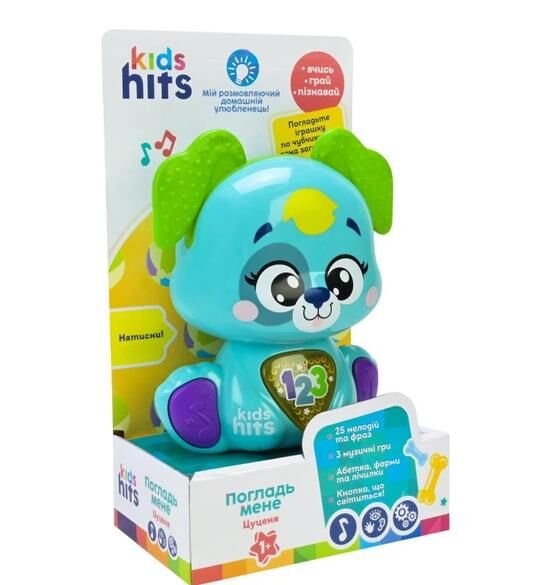 Зустрічай веселе цуценя від Kids Hits — іграшку, яка оживає під твоїм дотиком! Кожне натискання кнопки відкриває нові мелодії, фрази та навчальні ігри, роблячи кожну хвилину гри цікавою та захопливою.