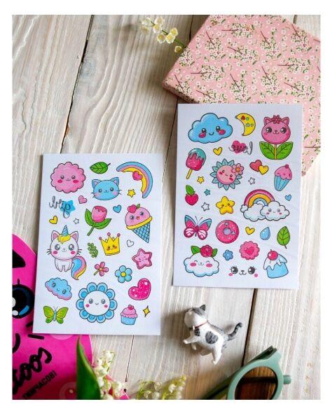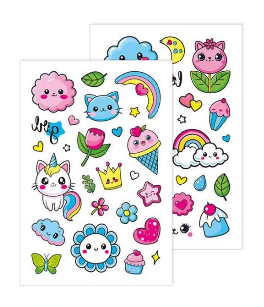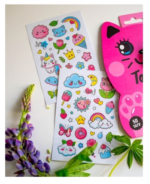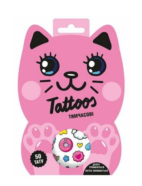 Тимчасові тату для дівчаток молодшого віку! Набір яскравих тимчасових татуювань у чарівному пакуванні у формі рожевого котика — справжня знахідка для маленьких модниць! Всередині — 2 аркуші з понад 50 стильними тату: хмаринки з оченятами, веселки, квіточки, морозиво, пончики, котоєдиноріжки, метелики, коронки, тістечка та модні надписи.