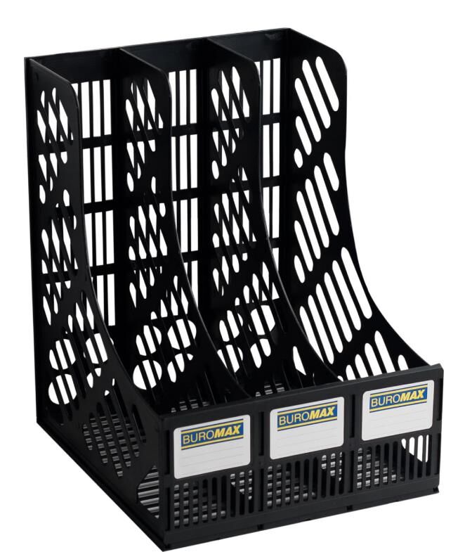 Вертикальний пластиковий лоток BUROMAX призначений для зберігання документів, каталогів, журналів, папок і т.п. Лоток виготовлений з поліпропілену (PP). Лоток складається з 3-х відділень. Розмір: 23х25.5х30.5 см.