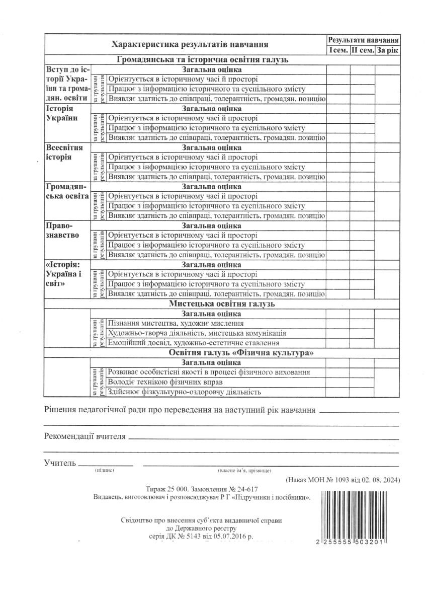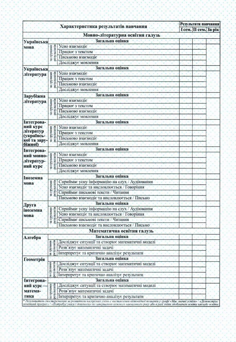 Надана форма Свідоцтва — орієнтовна, перелік предметів та інтегрованих курсів заклад освіти визначає відповідно до затвердженої освітньої програми.