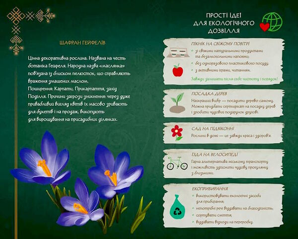 Серія недатованих щоденників, що мають безліч переваг. Їхні сторінки не прив’язані до певних місяців і днів року. Користуватися таким щоденником можна будь-коли, роблячи нотатки відповідно до своїх планів або міркувань про певні події. Місця для записів достатньо. Книжки зручні, мають стильний дизайн і прикрашені кольоровими ілюстраціями. До того ж вони містять цікаву й пізнавальну інформацію, що спонукає звернути увагу людства на екологічні проблеми довкілля. Такий щоденник стане вашим помічником або відмінним подарунком! Внутрішній блок: єдиний на серію. Тематика: екологія; тварини та рослини з Червоної Книги України; природні пам‘ятки України.