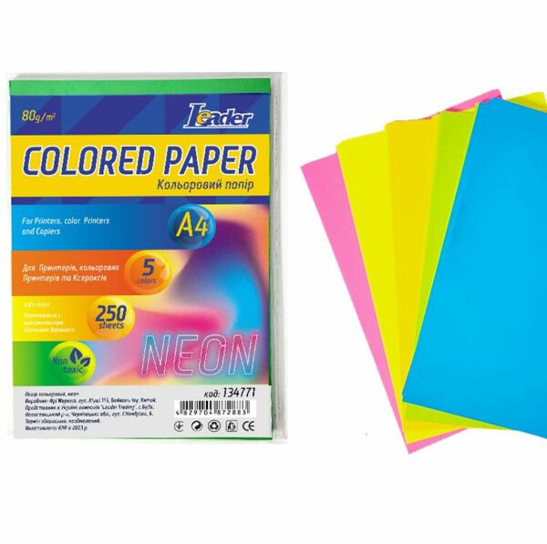 ПАПІР КОЛЬОРОВИЙ А4/80 250 аркушів 5 кольорів 50 аркушів НЕОН