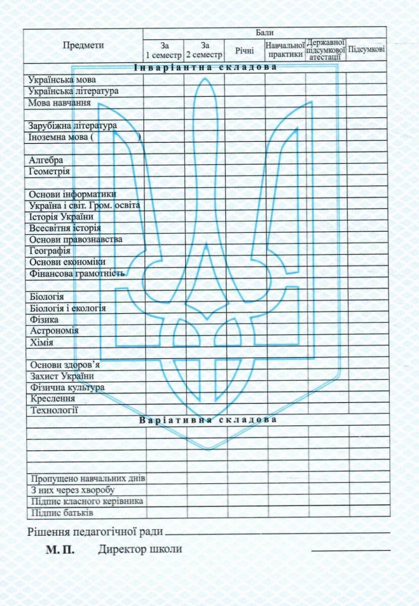табель для учнів 9-11 класи