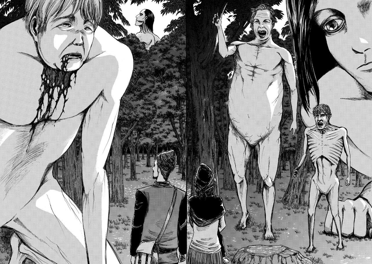 Через пробоїну, яку колос зробив у мурі, титани покотом полізли в місто. Мікасу розбила звістка про загибель Ерена. Вона вбиває ворогів одне за одним, аж поки не падає... Та раптом з'являється таємничий титан, який рятує Мікасу з лап іншого. Хто він, цей титан, що боре інших титанів, скільки стає сил?