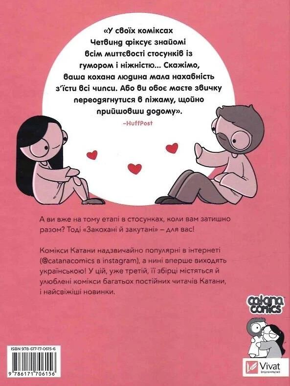 Мальопис «Закохані й закутані» Катани Четвинд нагадує про щастя, яке оточує людину щодня: домашній затишок, теплі піжами й подарунки-дрібнички. Авторка тлумачить сутність мови кохання та безліч способів її вираження, наприклад: «Які маленькі в тебе ручки! Як ти взагалі можеш тримати речі?». Четвинд говорить про прийняття одне одного без спроб здатися кращою версією себе, адже в очах, що кохають, ви вже є найпрекраснішою людиною на Землі.