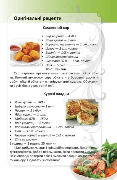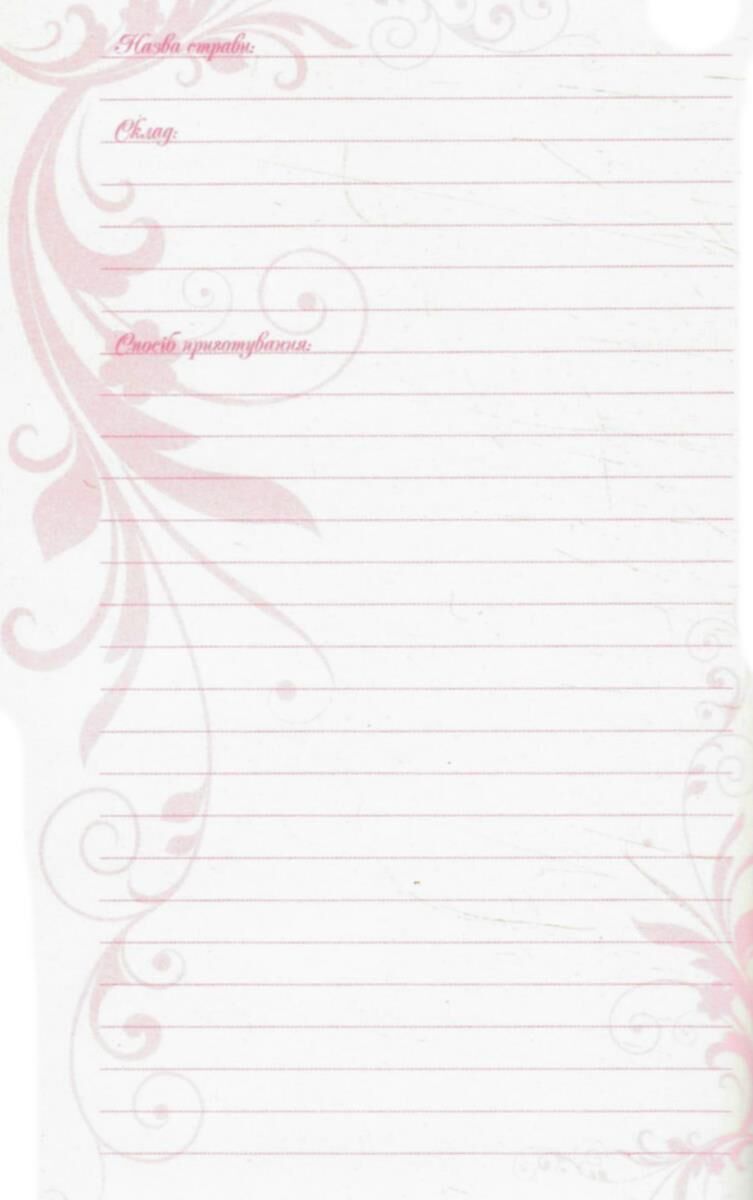 Зручна і потрібна кожній господині книга, адже тут можна записати будь-який рецепт, щоб згодом повернутися до нього і приготувати бажану страву. До того ж книга зручна у користуванні — кожний її розділ відділений кольоровою сторінкою з крейдованого паперу та містить цікаві рецепти страв.