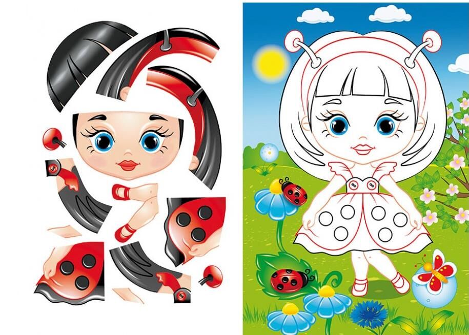 Кожна сторінка пропонує вирізати деталі та акуратно приклеїти їх на основу, розвиваючи посидючість і увагу до деталей.