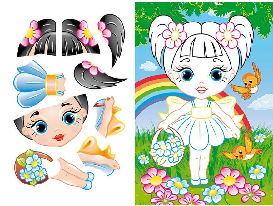На сторінках книги малюків чекають яскраві персонажі та цікаві завдання: зібрати образ милої сонечка, створити чарівну відьмочку до Гелловіну, прикрасити ніжну дівчинку з квітами на лузі.