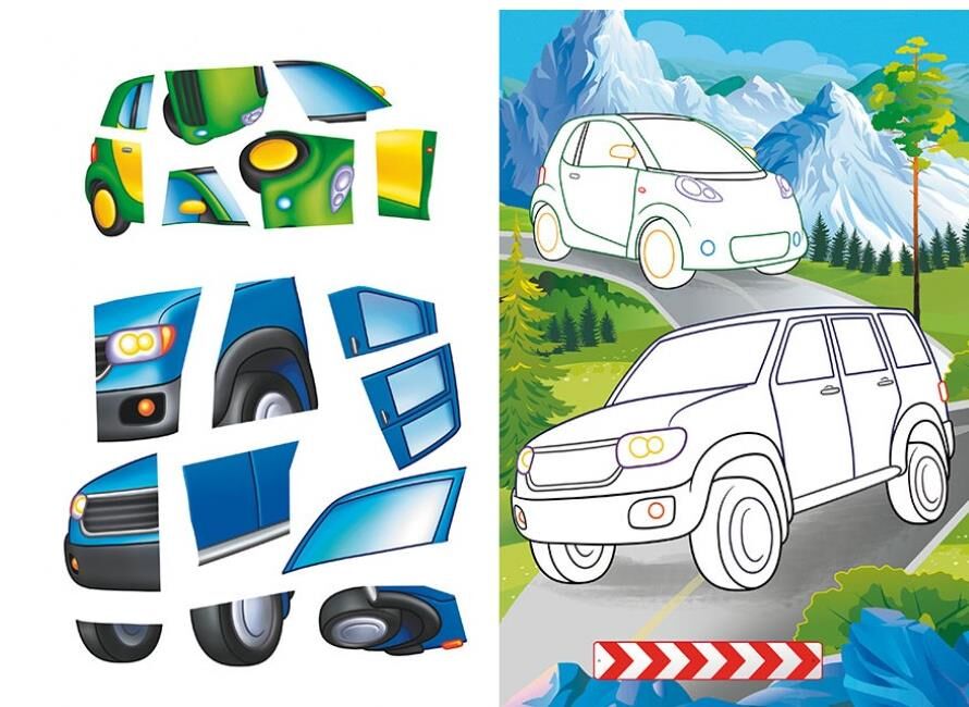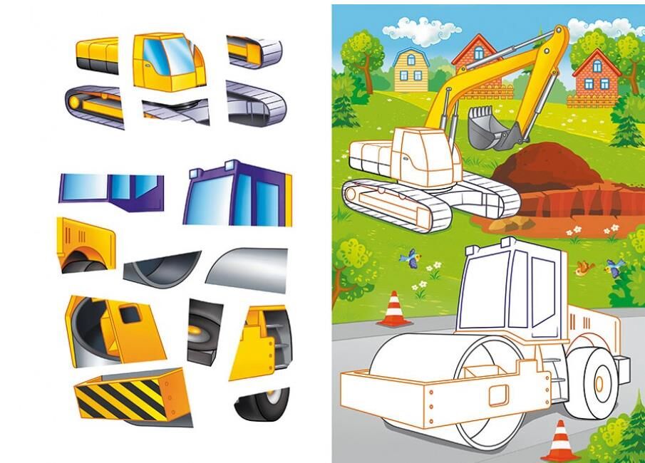 - Яскраві, великі аплікації оживають у дитячих руках, перетворюючись на захопливі будівельні машини та автомобілі.