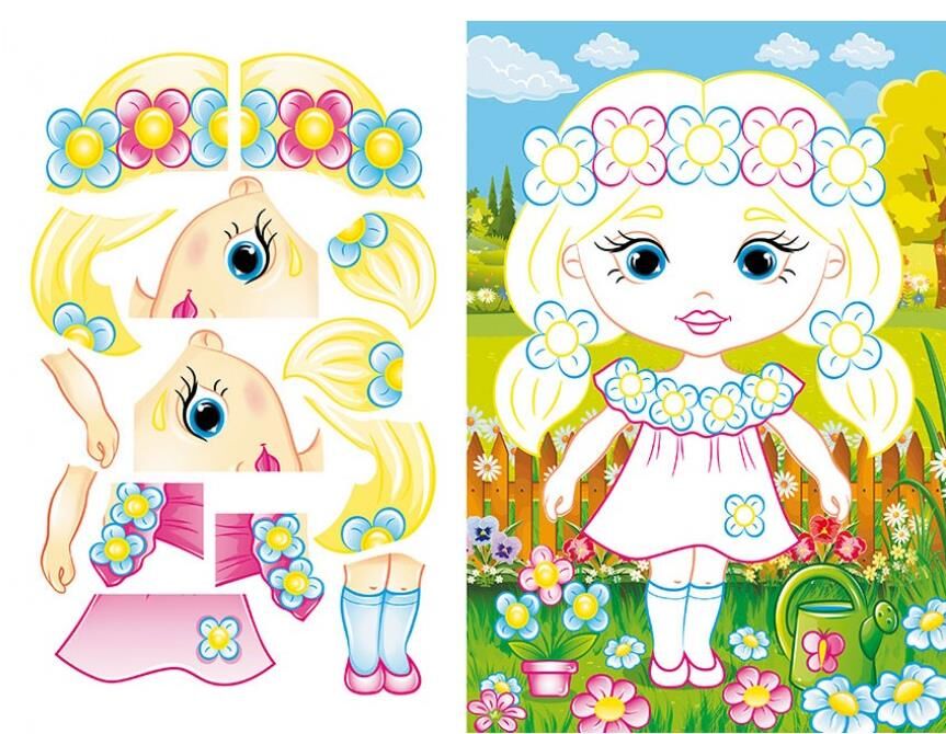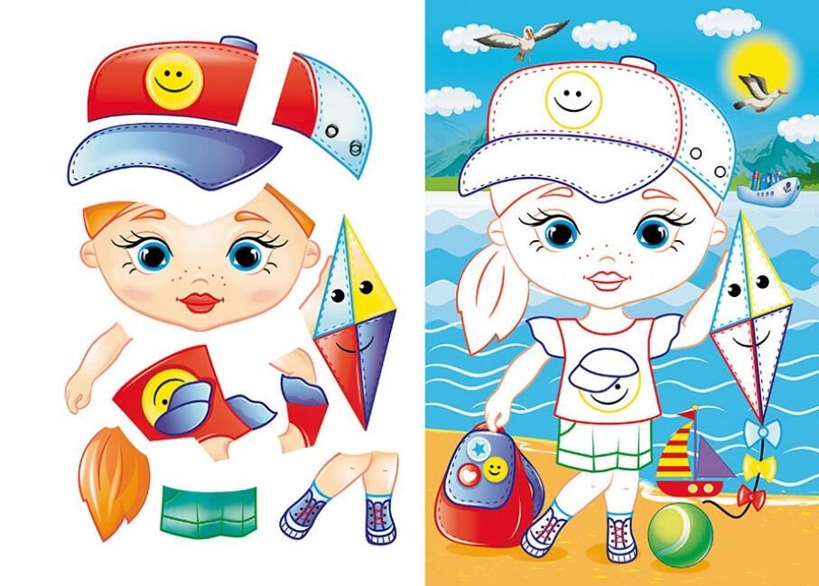 Дитина бере частини персонажів, вирізає їх і наклеює на фон, створюючи власну картинку!