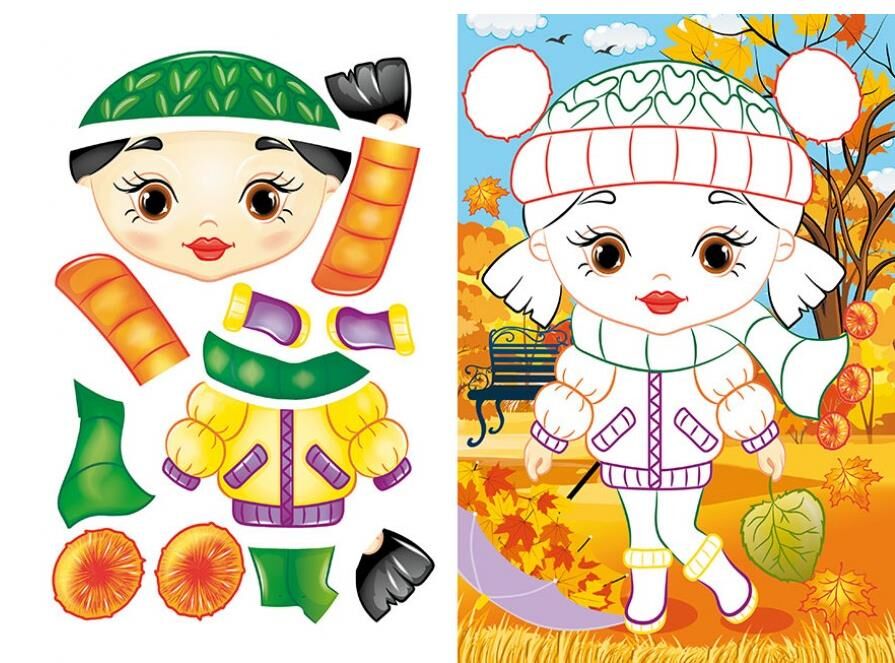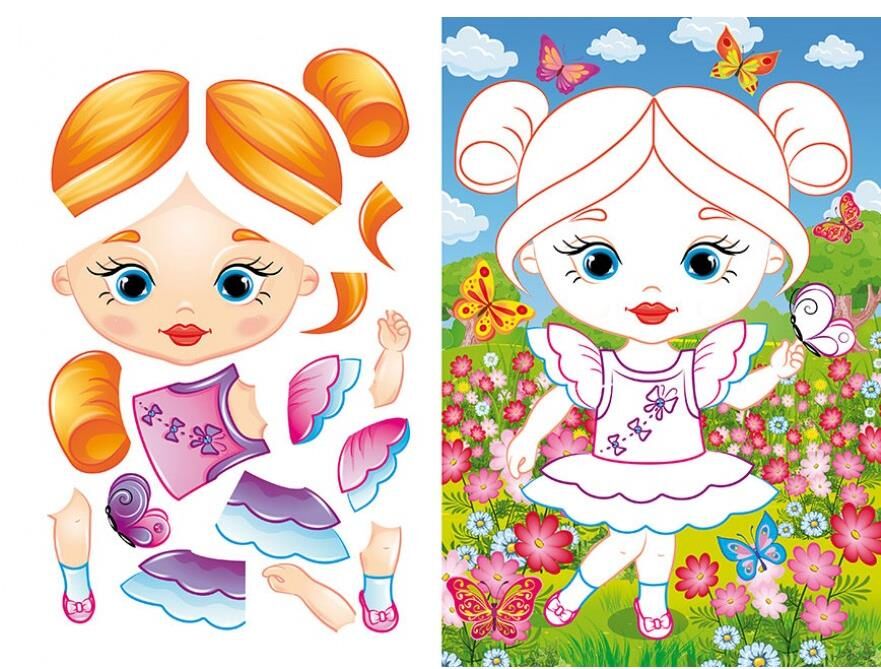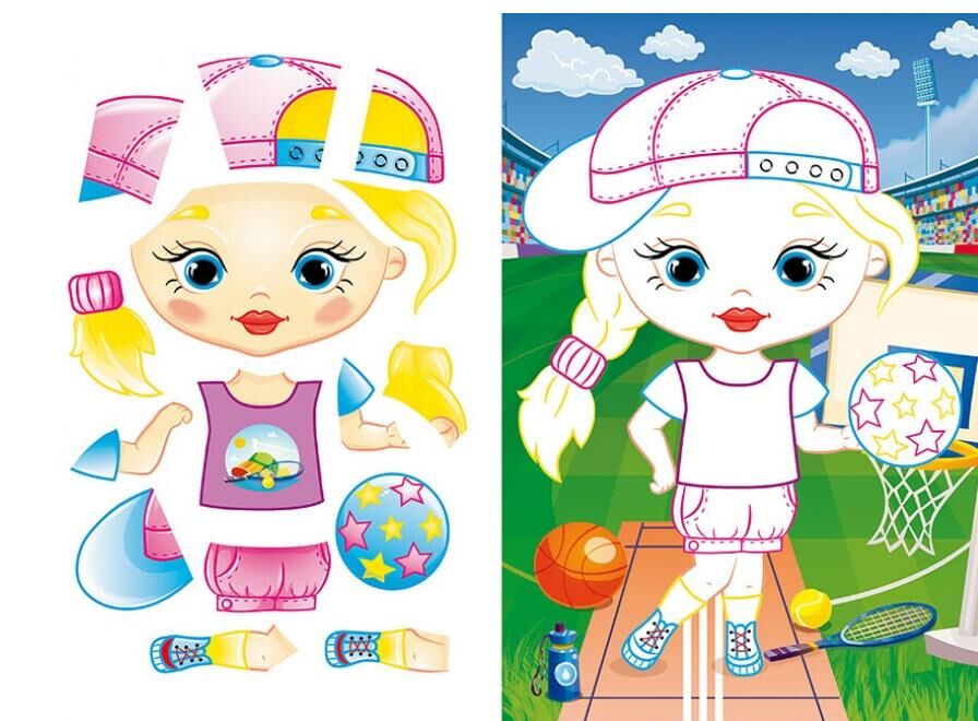 Аплікації перетворюються на справжні шедеври завдяки ніжним малюнкам і веселим персонажам. Збираючи яскраві образи, дитина порине у світ моди та спорту, відчує себе справжньою дизайнеркою.