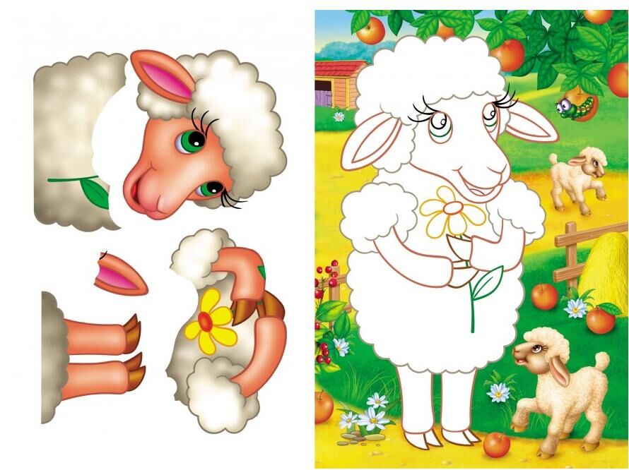 - Яскраві ілюстрації із зображенням домашніх тварин, таких як корова, коник, овечка, поросятко та інші, зроблять заняття веселими й пізнавальними.