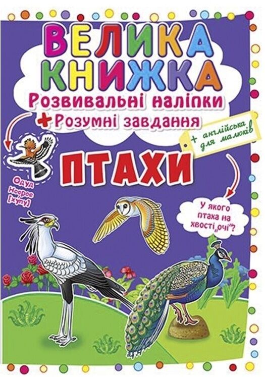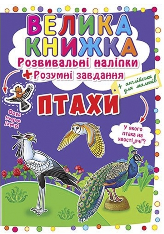 «Велика книжка. Розвивальні наліпки. Розумні завдання. Птахи» — це інтерактивне навчально-творче видання для дітей дошкільного віку, яке занурює у захопливий світ пернатих. На великих сторінках зображено різноманітних птахів із усього світу: водоплавних, екзотичних, лісових, хижих. Дитина наклеює наліпки-підказки у відповідні місця, виконує завдання на пошук, порівняння, класифікацію, а також знайомиться з назвами птахів українською та англійською мовами. Така діяльність сприяє розвитку дрібної моторики, уваги до деталей, просторового мислення та мовленнєвих навичок. Видання українською мовою, має м’яку палітурку і велике форматне оформлення, що підходить для роботи вдома або в групі.