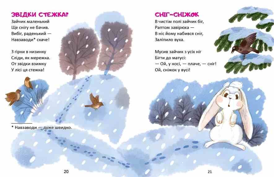 Книга віршів Володимира Верховня стане чудовим подарунком для вашої дитини. Тут знаходимо і довгий вірш-безкінечник, і короткі віршики-стрибайчики (що, до речі, сюжетні, тож їх легко перетворити на сценки для гри), і ніжні вірші до сну, і вигадливі, кумедні вірші про хвалькуватих зайців та інших лісових мешканців. Кожна сторінка — окрема цікава віршована історія, ілюстрована надзвичайними малюнками Наталії Шерстюк.