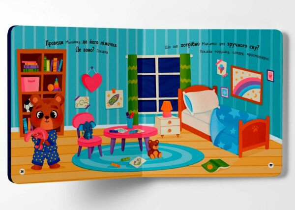 Ця інтерактивна книжка підкаже батькам, як в ігровій формі допомогти дитині навчитися самостійно лягати в ліжко і засинати без вередувань. Разом з милим героєм ваш малюк засвоюватиме важливі навички: запам’ятає правильну послідовність дій — покласти іграшки на місця, покупатися, відвідати горщик, одягти піжамку, лягти в ліжечко, заплющити оченятка. А якщо раптом не вийде з першого разу — не варто засмучуватися, треба зробити цей процес щоденним ритуалом. Також малюк дізнається, навіщо відпочивати вночі, і як це роблять тваринки та комашки.