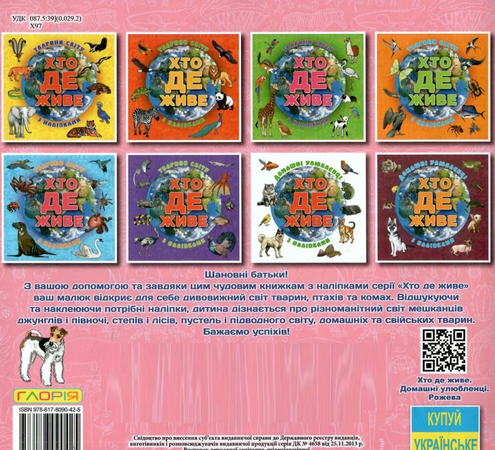 З вашою допомогою та завдяки цим чудовим книжкам з наліпками серії «Хто де живе» ваш малюк відкриє для себе дивовижний світ тварин, птахів та комах. Відшукуючи та наклеюючи потрібні наліпки, дитина дізнається про різноманітний світ мешканців джунглів і півночі, степів і лісів, пустель і підводного світу, домашніх та свійських тварин.