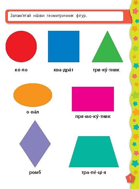 Ця книга познайомить вашу дитину з основними геометричними фігурами, такими як квадрат, трикутник, коло, прямокутник, ромб, овал та трапеція. Виконуючи захопливі
