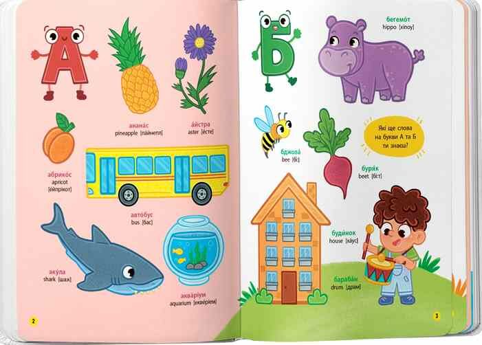 Ця книжка допоможе дитині в ігровій формі вивчити абетку та засвоїти нові слова, навчитися чітко та правильно їх вимовляти, а також сприятиме розвитку логічного мислення та вивченню навколишнього світу. На кожному розвороті малюк бачитиме великі кольорові малюнки, запам’ятовуватиме нові слова, відшукуватиме задані предмети, відповідатиме на запитання. Підписи в книжці подано двома мовами, що зробить вивчення англійської легким і веселим навіть для найменших.