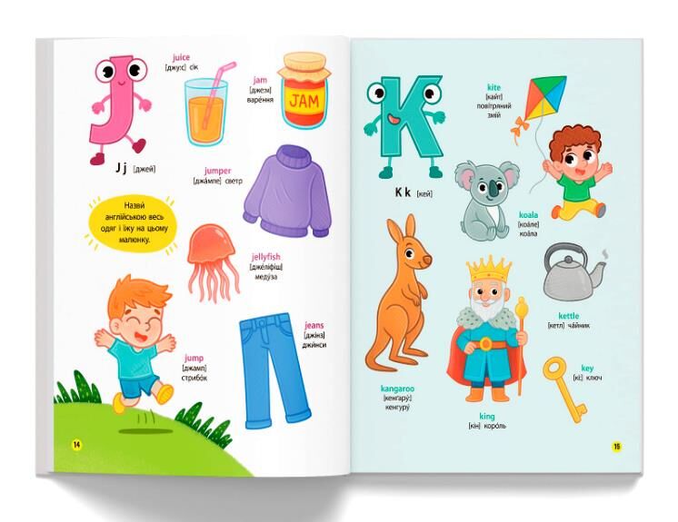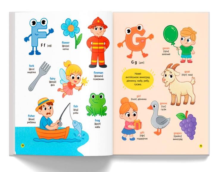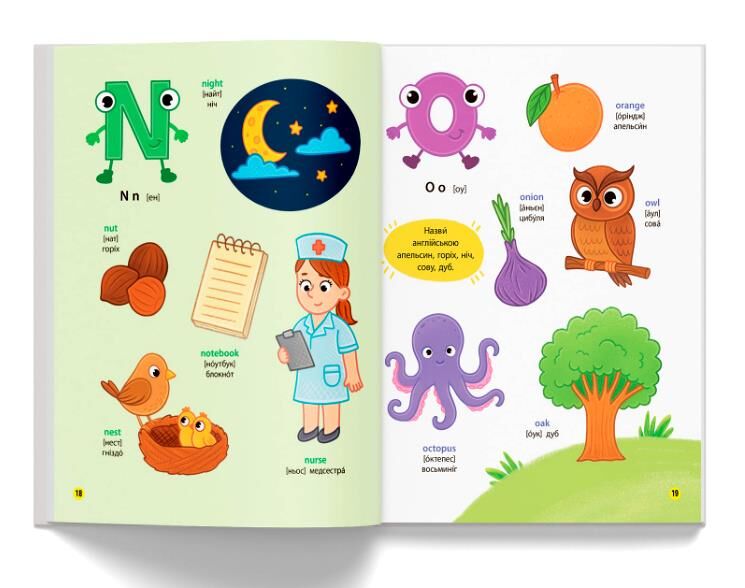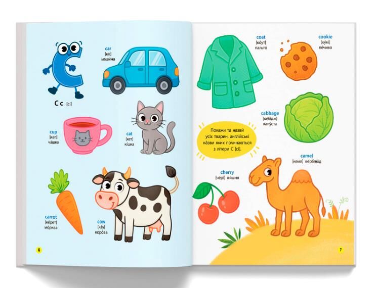 Ця книжка допоможе дитині в ігровій формі вивчити англійську абетку та засвоїти нові слова, навчитися чітко та правильно їх вимовляти, а також сприятиме розвитку логічного мислення та вивченню навколишнього світу. На кожному розвороті малюк бачитиме великі кольорові малюнки, запам’ятовуватиме нові слова, відшукуватиме задані предмети, відповідатиме на запитання. Підписи в книжці подано двома мовами, що зробить вивчення англійської легким і веселим навіть для найменших.