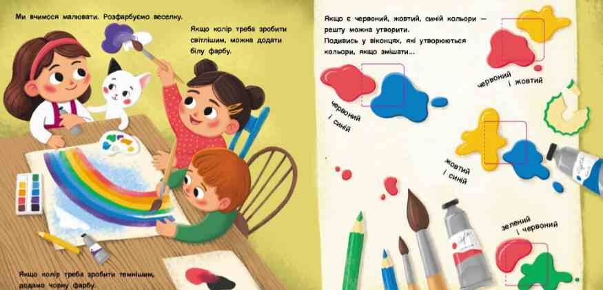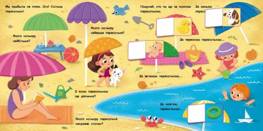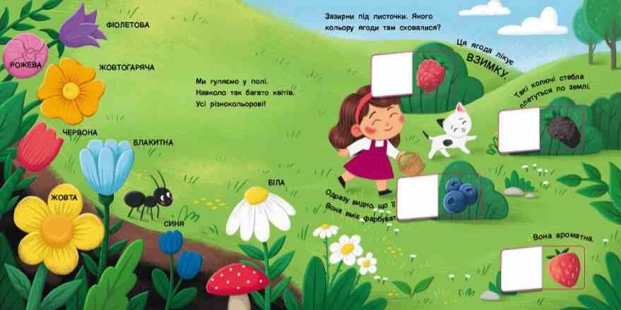 Навколо так багато різних кольорів. Достатньо лиш уважно роззирнутися. Нумо досліджувати кольори навколо! Ми зазирнемо в різні куточки: - погуляємо у полі, - вирушимо у подорож, - відпочинемо на пляжі, - сходимо в океанаріум, - зайдемо у великий іграшковий супермаркет. Ох і цікаві будуть пригоди!