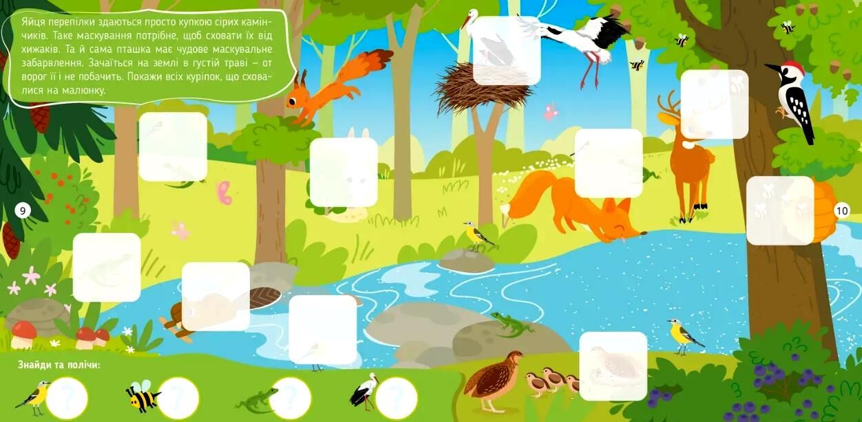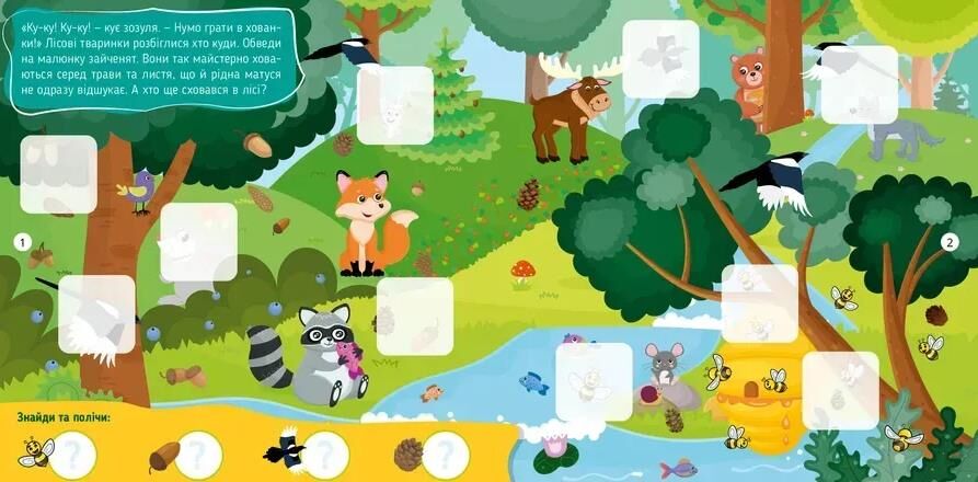 Де заховалося зайченятко, а хто це співає в траві? Нумо шукати! Виконуючи завдання на кожній сторінці, дитина розвине спостережливість і навички лічби. А ще дізнається багато цікавинок про тварин, що живуть у лісі й на луці, зможе вигадати свої історії за малюнками, що важливо для розвитку фантазії, творчого й логічного мислення вашого маленького дослідника. Отож запрошуємо вивчати навколишній світ разом з пізнавальною книжкою «У лісі й на луці».