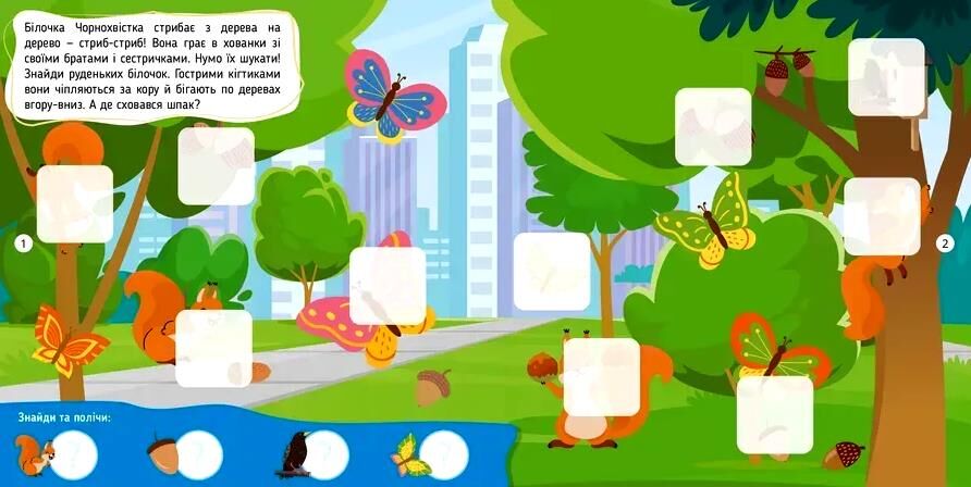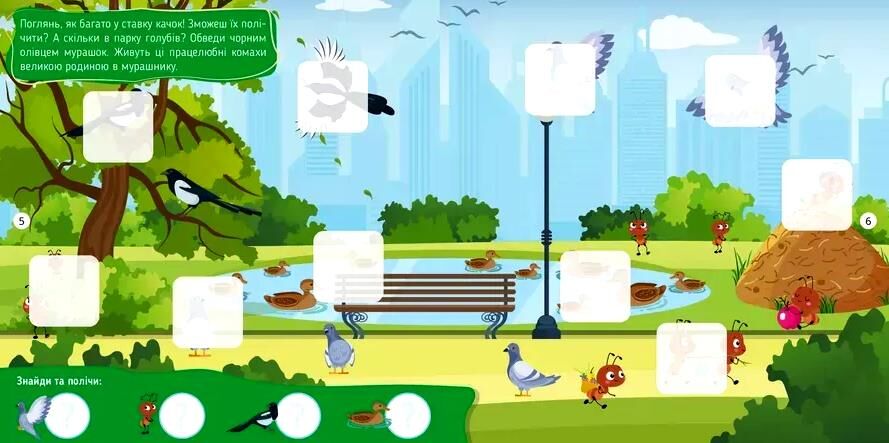 Де сховалася білочка Чорнохвістка, а де птах із червоною шапочкою? Нумо шукати! Виконуючи завдання на кожній сторінці, дитина розвине спостережливість і навички лічби. А ще дізнається багато цікавинок про тварин, що живуть у міському парку, зможе вигадати свої історії за малюнками, що важливо для розвитку фантазії, творчого й логічного мислення вашого маленького дослідника. Отож запрошуємо вивчати навколишній світ разом з пізнавальною книжкою «У міському парку».