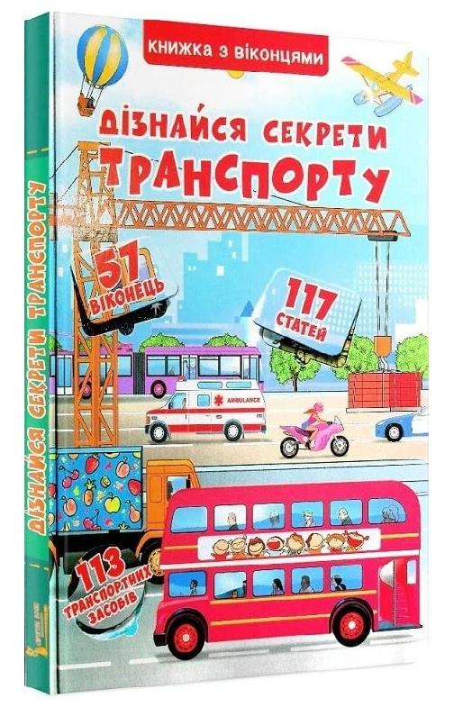 «Книжка з віконцями. Дізнайся секрети транспорту»- книга допоможе дізнатися, як працюють різні види транспорту. Ти побуваєш на будівництві, дізнаєшся, навіщо потрібні вантажні автомобілі, як влаштовані літаки (тобі навіть вдасться заглянути в кабіну до пілота) і круїзні лайнери, машини-рятувальники і сільськогосподарська техніка (наприклад, як влаштований комбайн і як відбувається збір урожаю). Транспорт буває дуже різний, як пояснити дитині, що робить та чи інша машина і для чого вона потрібна людині. За допомогою книги, ви зможете показати дитині всю різноманітність машин.