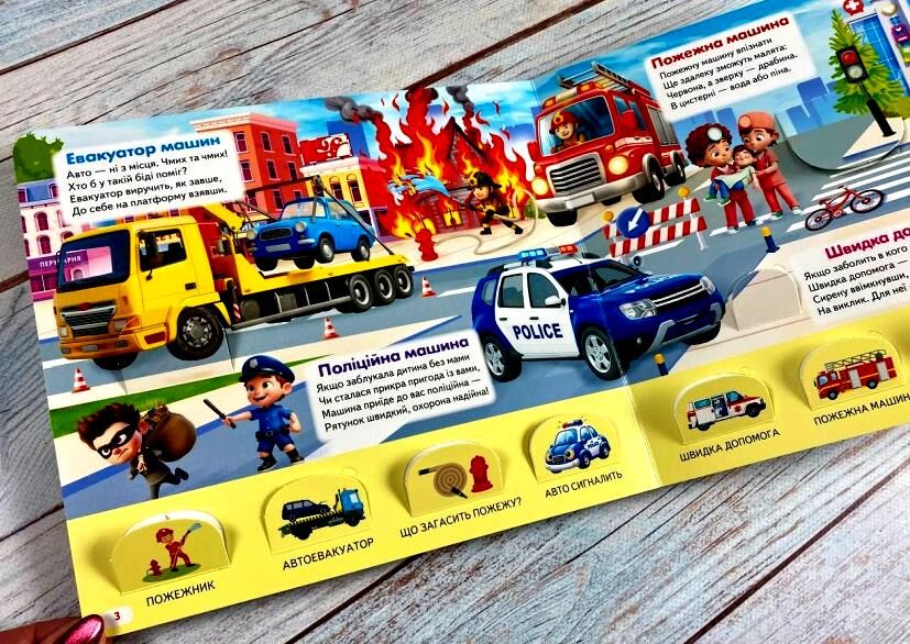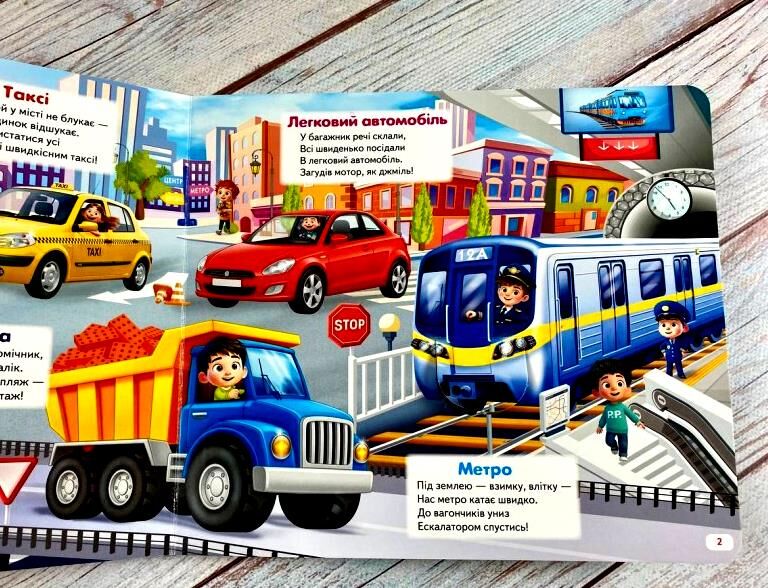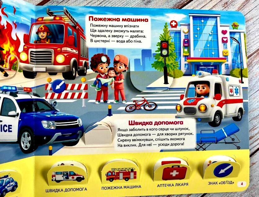 Що всередині: 10 цупких картонних сторінок з міським транспортом — таксі, метро, автобус, легковий автомобіль, вантажівка спецтранспорт (поліція, пожежна, швидка, евакуатор) будівельна техніка (бетонозмішувач, поливальна, прибиральна) легкий транспорт (мотоцикл, скутер, велосипед, електросамокат). Не просто малюнки, а рольові сценарії: "Поліцейський їде на виклик", "Пожежник гасить пожежу", "Водій таксі везе пасажира".
