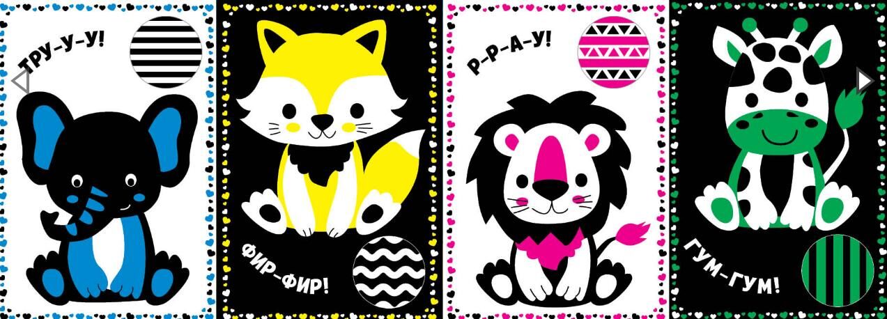 Серія «Контрастні картинки» створена для немовлят, які тільки-но починають пізнавати світ. Вона містить великі чорно-білі картинки з певними акцентними кольорами, які буде зручно розглядати малечі, лежачи в ліжечку чи бавлячись на килимку. У кожній книжечці є наліпки, якими можна урізноманітнити та доповнити зображення через певний час або ж використати їх для створення власної картинки. Видання серії допоможуть малюкові розвинути зір і сприйняття, навчитися фокусувати погляд, удосконалити навички візуального відслідковування та розпочати знайомство з кольорами.