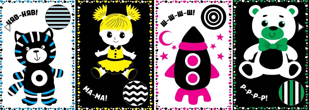 Серія «Контрастні картинки» створена для немовлят, які тільки-но починають пізнавати світ. Вона містить великі чорно-білі картинки з певними акцентними кольорами, які буде зручно розглядати малечі, лежачи в ліжечку чи бавлячись на килимку. У кожній книжечці є наліпки, якими можна урізноманітнити та доповнити зображення через певний час або ж використати їх для створення власної картинки. Видання серії допоможуть малюкові розвинути зір і сприйняття, навчитися фокусувати погляд, удосконалити навички візуального відслідковування та розпочати знайомство з кольорами.