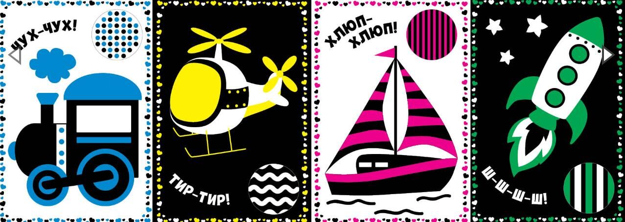Серія «Контрастні картинки» створена для немовлят, які тільки-но починають пізнавати світ. Вона містить великі чорно-білі картинки з певними акцентними кольорами, які буде зручно розглядати малечі, лежачи в ліжечку чи бавлячись на килимку. У кожній книжечці є наліпки, якими можна урізноманітнити та доповнити зображення через певний час або ж використати їх для створення власної картинки. Видання серії допоможуть малюкові розвинути зір і сприйняття, навчитися фокусувати погляд, удосконалити навички візуального відслідковування та розпочати знайомство з кольорами.