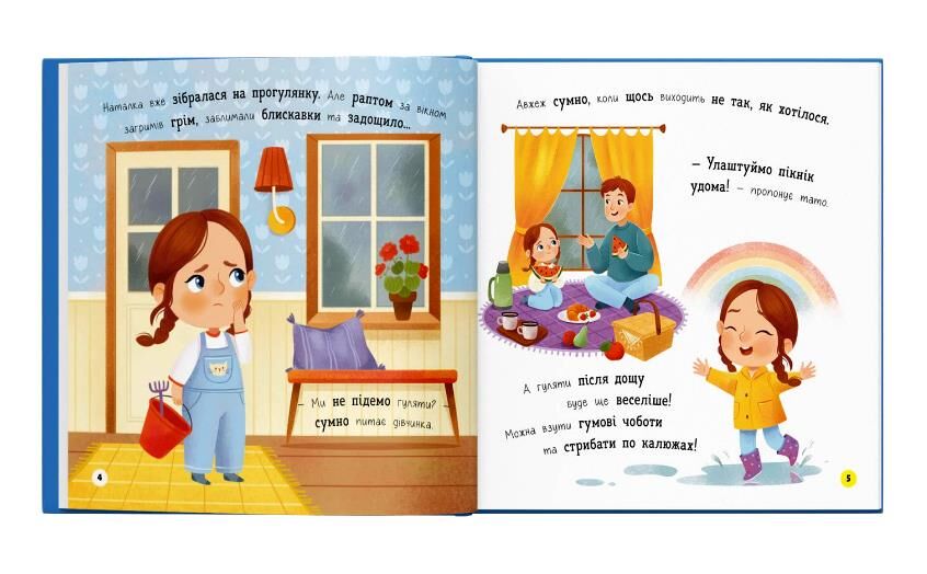 На кожному розвороті дитина познайомиться з новим персонажем і ситуацією, яка викликає сум: зламалася іграшка, дощ змив малюнок, закінчилося свято чи мама була зайнята молодшим братиком. Малюк побачить, що сум — це природна емоція, яку відчуває кожна дитина. І можна навчитися долати його та знаходити нові приводи для радості. Видання призначене для дітей віком від 1,5 років та їхніх турботливих батьків.