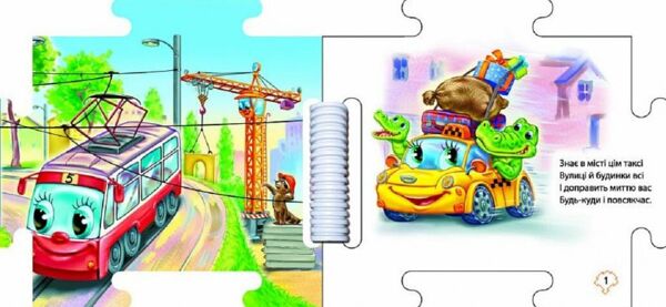 Сім чудових віршів про машини у місті. Вісім великих цупких та зручних для малюка пазлів, що складаються в картинку-панно розміром 65х30см. Й це ще не все, бо аналогів такій книзі в Україні немає.