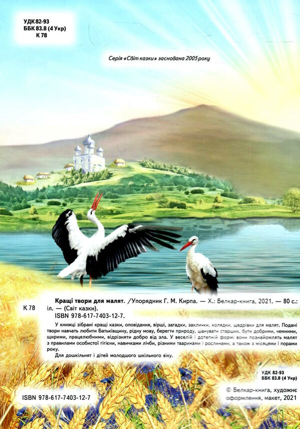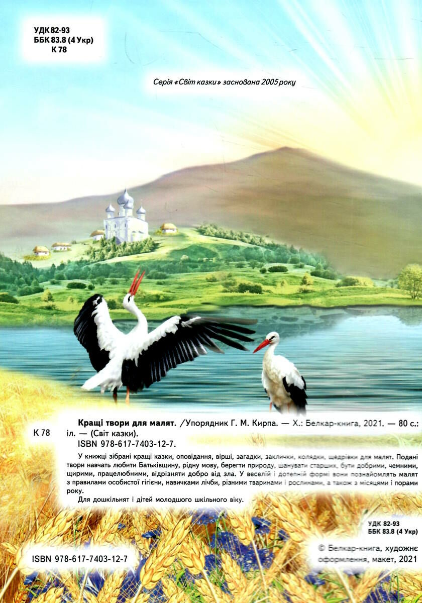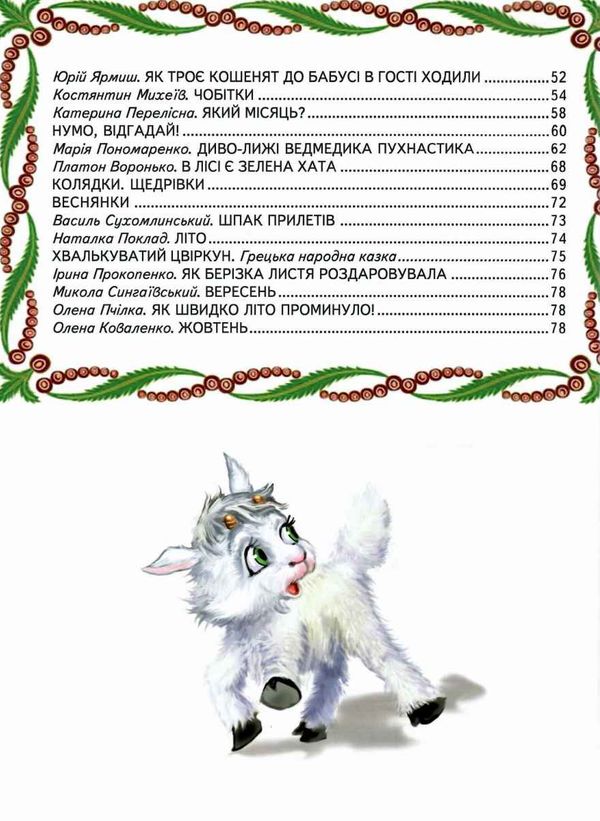 У книжці зібрані кращі казки, оповідання, вірші, загадки, заклички, колядки, щедрівки для малят. Подані твори навчать любити Батьківщину, рідну мову, берегти природу, шанувати старших, бути добрими, чемними, щирими, працелюбними, відрізняти добро від зла. У веселій і дотепній формі вони познайомлять малят з правилами особистої гігієни, навичками лічби, різними тваринами і рослинами, а також з місяцями і порами року.