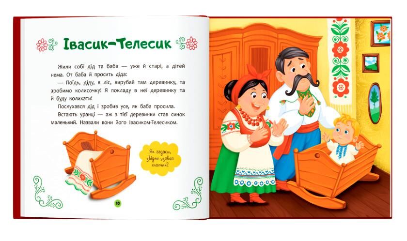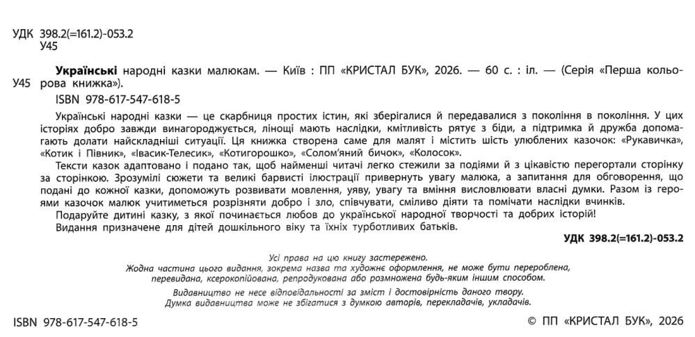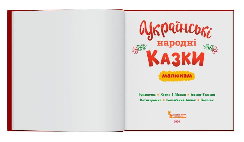 Українські народні казки — це скарбниця простих істин, які зберігалися й передавалися з покоління в покоління. У цих історіях добро завжди винагороджується, лінощі мають наслідки, кмітливість рятує з біди, а підтримка й дружба допомагають долати найскладніші ситуації. Ця книжка створена саме для малят і містить шість улюблених казочок: «Рукавичка», «Котик і Півник», «Івасик-Телесик», «Котигорошко», «Солом’яний бичок», «Колосок». Тексти казок адаптовано і подано так, щоб найменші читачі легко стежили за подіями й з цікавістю перегортали сторінку за сторінкою. Зрозумілі сюжети та великі барвисті ілюстрації привернуть увагу малюка, а запитання для обговорення, що подані до кожної казки, допоможуть розвивати мовлення, уяву, увагу та вміння висловлювати власні думки. Разом із героями казочок малюк учитиметься розрізняти добро і зло, співчувати, сміливо діяти та помічати наслідки вчинків.