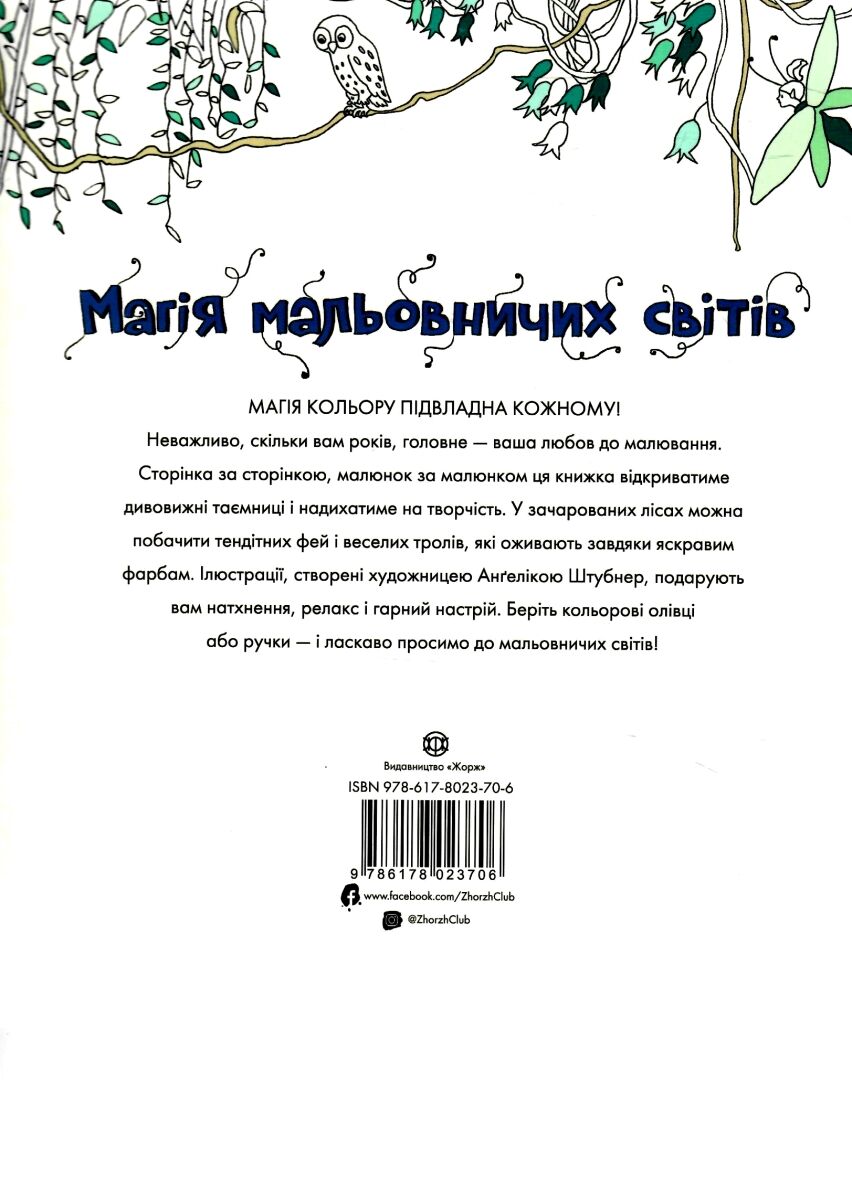МАГІЯ КОЛЬОРУ ПІДВЛАДНА КОЖНОМУ! Неважливо, скільки вам років, головне — ваша любов до малювання. Сторінка за сторінкою, малюнок за малюнком ця книжка відкриватиме дивовижні таємниці і надихатиме на творчість. Чарівний олівець ілюстраторки Анґеліки Штубнер перетворює звичайні речі, які нас оточують, на дивовижні й дуже милі образи. Вам залишиться тільки розфарбувати їх і доповнити історію на власний розсуд. Беріть кольорові олівці або ручки — і ласкаво просимо до мальовничих світів!