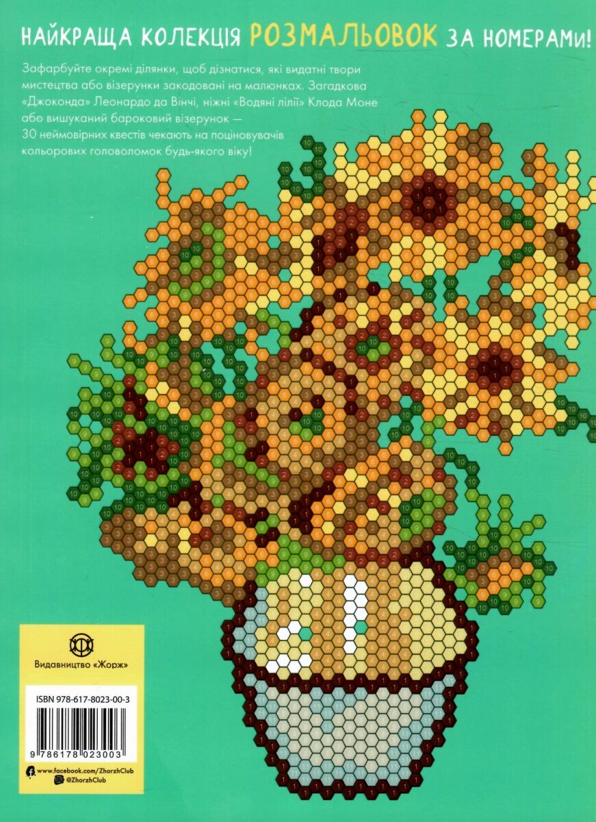 Зафарбуйте окремі фігури, щоб дізнатися, які видатні твори мистецтва або візерунки закодовані на малюнках. Загадкова «Джоконда» Леонарда да Вінчі, ніжні «Водяні лілії» Клода Моне або яскраві «Соняшники» Вінсента Ван Гога — 30 неймовірних квестів чекають на поціновувачів кольорових головоломок будь-якого віку!