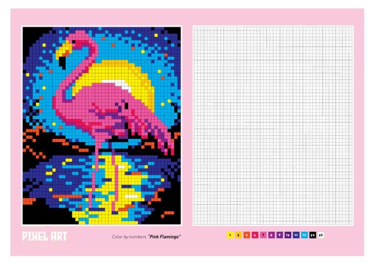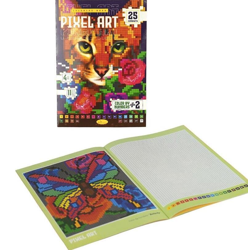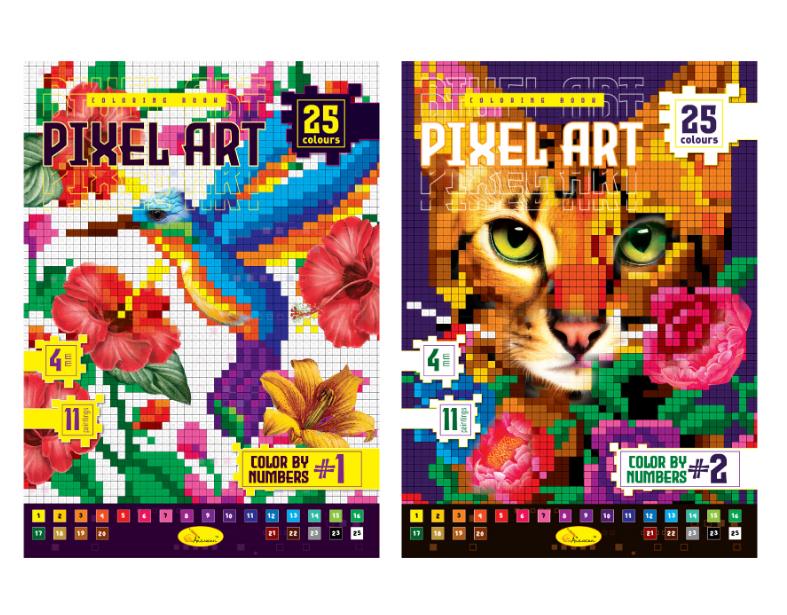 Розмальовка "PIXEL ART" формату 210х297 мм включає 20 аркушів з унікальними ілюстраціями. Кожен малюнок поділено на клітини з номерами, що відповідають 25 кольорам. Обкладинка виконана з целюлозного картону 200 г/м² з повнокольоровим друком та ламінацією. Блок складається з офсетного паперу 100 г/м² із кольоровим друком. Мова: українська.