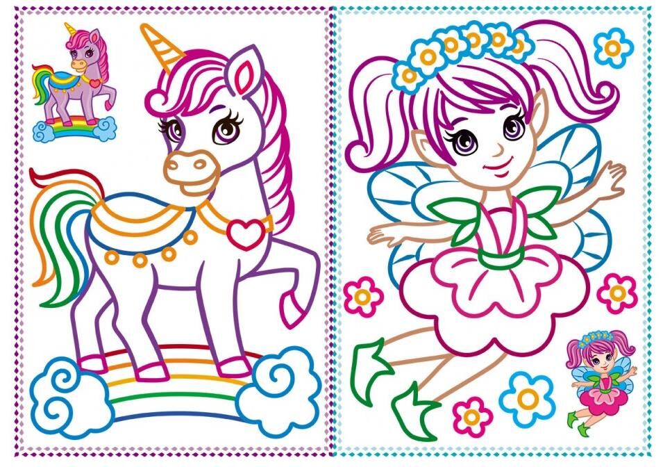 Натхненні образи фей, єдинорогів, принцес і квітів допоможуть маленькій художниці розкрити творчий потенціал і навчитися акуратно працювати з фарбами.