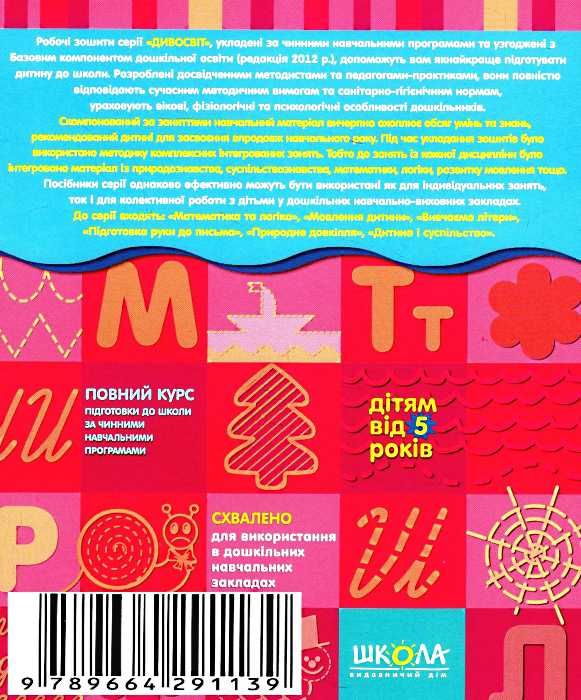 Робочі зошити серії «ДИВОСВІТ», укладені за програмою «Я У СВІТІ», допоможуть вам якнайкраще підготувати дитину до школи. Розроблені досвідченими методистами та педагогами-практиками, вони повністю відповідають сучасним методичним вимогам та санітарно-гігієнічним нормам, ураховують вікові, фізіологічні та психологічні особливості дошкільників. Скомпонований за заняттями навчальний матеріал вичерпно охоплює обсяг умінь та знань, рекомендований дитині для засвоєння впродовж навчального року. Під час укладання зошитів було використано інноваційну технологію інтегрованих занять. Тобто до занять із кожної дисципліни було інтегровано матеріал з усіх базових напрямів навчання: природознавства, суспільствознавства, математики, логіки, розвитку мовлення тощо. Посібники серії однаково ефективно можуть бути використані як для індивідуальних занять, так і для колективної роботи з дітьми у дошкільних навчально-виховних закладах. Працюючи із цим посібником, дитина розвине дрібні м’язи і координацію пальців та кисті руки, окомір (визначення центра фігур, середини аркуша паперу) і просторові уявлення (ліворуч, праворуч, унизу, над і під лінією). Крім того, вона навчиться різних видів штрихування готових контурів, удосконалить навички розфарбовування предметів, навчиться писати цифри та друковані літери.